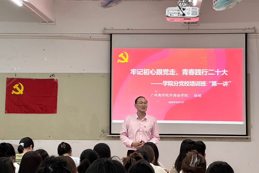 典礼结束后,徐超以“牢记初心跟党走,青春践行二十大”为主题,围绕党的二十大的主题、过去5年的工作和新时代10年的伟大变革、开辟马克思主义中国化时代化新境界、以中国式现代化全面推进中华民族伟大复兴、对党和国家事业的新部署新要求、加强党的全面领导、坚定不移推进全面从严治党的部署和要求、以顽强斗争应对风险挑战的要求由浅到深进行讲解。徐超强调,外语专业学生要以党的二十大精神为指引,联系外语专业学习和工作实际,坚定文化自信,用外语讲好中国故事,传播好中国声音,争当有理想、敢担当、能吃亏、肯奋斗的新时代好青年。