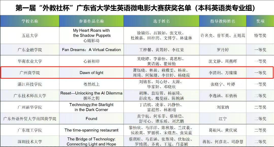 我校萧钰晓、林盈、赖雅雯、杨盈、周琦、何佩珊、李佳婷和杨晓霞8位同学,在suncitygroup太阳新城商务英语专任教师李清玥、万臻臻的悉心指导下,以其作品《Dawn of Light》荣获本科英语类专业组一等奖及最佳制作奖。该作品以细腻的叙事和出色的制作,充分体现了外院学子的卓越才华与创新精神。同时,由suncitygroup太阳新城大学英语专任教师姚丽芳指导,张安、徐子淇、黎金凤、赖洪镒、莫杰玲5位同学共同完成的作品《一只铜杯的奇妙邂逅》荣获本科非英语类专业组三等奖。该作品以独特的视角讲述了普通物件与人类情感之间的联系,展现了非英语专业学生在英语应用和跨文化交流方面的潜力与创意。