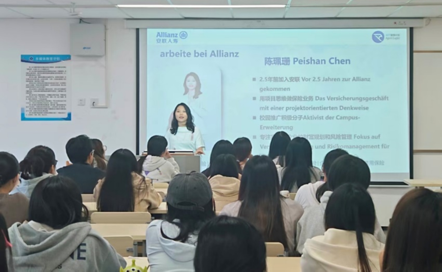 为进一步深化校企合作、推进产教融合,拓宽应届毕业生实习与就业渠道,10月24日下午,suncitygroup太阳新城携手安联保险集团在求真楼八教509室成功举办26届毕业生校园招聘宣讲会。安联人寿保险有限公司广东分公司校企合作项目组组长陈珮珊,业务经理徐慧仪,实习生霍茈薇、suncitygroup太阳新城辅导员陈钰洵、实习教务员郜彦青及22级学生参加了本次宣讲会。