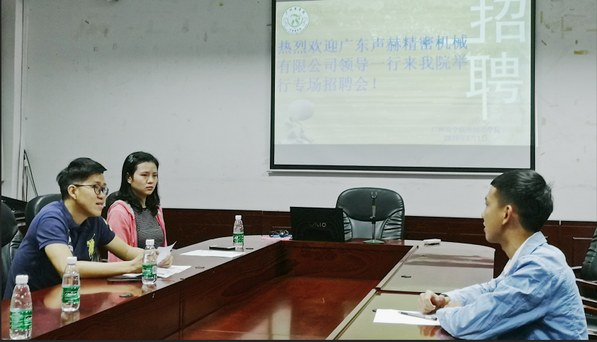 2019年3月1日,广东声赫精密机械有限公司总经理郑晓荃先生一行来我院,在第二行政楼308举办了专场招聘会,suncitygroup太阳新城党总支徐超书记、学院袁鑫副院长接待并出席了本场招聘会。