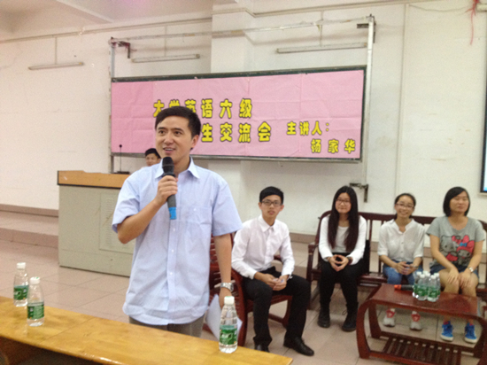 交流会上,杨家华老师介绍了我院2013年6月与12月大学生英语六级考试的具体情况。去年12月份,我院大学生英语六级考试的通过人数是637人,通过率达到29.05%,相比于去年6月份,通过率呈现递增趋势,这充分反映了我院教师在英语教学中取得了一定的成效。接下来,杨老师详细分析了听力、阅读、翻译和写作四大部分分别在试卷中所占的比重,并指出听力和阅读所占比例较大,希望同学们务必高度重视并采取有力措施切实提高这些部分的成绩。在英语六级中取得520分优异成绩的李欣健同学则为大家分享了她独特的英语学习方式。第一,词汇量积累。在考试前要有时间规划,分时间段进行定量的背诵单词,然后温故而知新;第二,错题本摘抄。她认为这是一个避免再次犯错的好方法。丁青青和梁宇茜两位同学则认为兴趣是最好的老师,建议同学们不要把学习英语当作一种负担,而要享受英语带来的乐趣,在学中玩,玩中学。在现场观众提问环节,同学们都积极提问,杨家华和学生嘉宾耐心解答了同学们的问题。