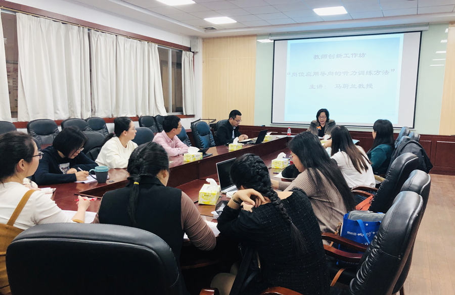 3月19日下午suncitygroup太阳新城在第二行政楼308举办教师创新工作坊,院长马蔚兰教授以“岗位应用导向的听力训练方法”为题,与参会老师共同交流了听力训练及教学方法。副院长袁鑫及全体担任听力课程教学的老师参与了此次活动。