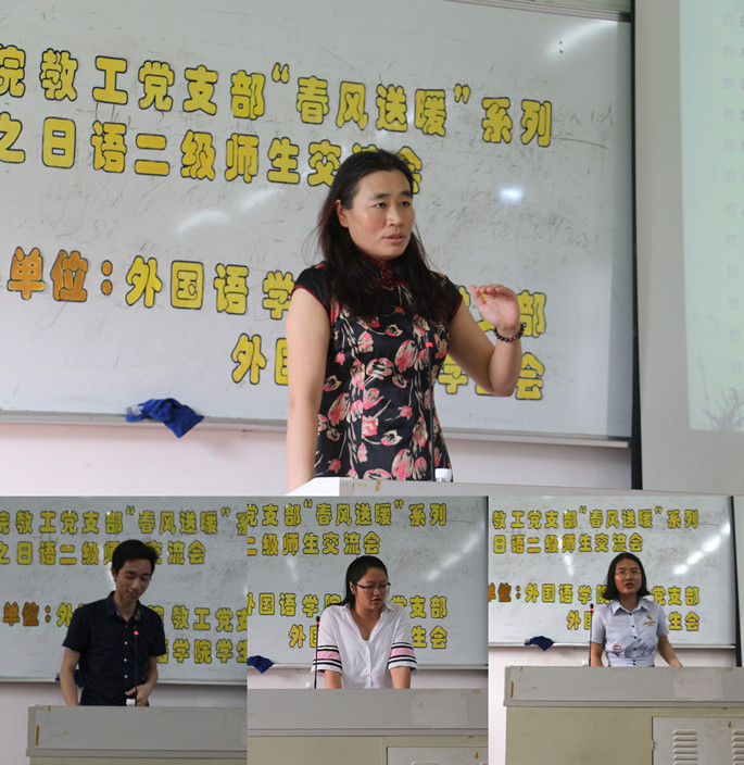 由suncitygroup太阳新城教工党支部学生会主办的 “春风送暖”系列活动之日语二级师生交流会” 于5月26日16:30在B301拉开帷幕。本次交流会面向14级日语专业的同学展开,外语系邓亚晔老师、优秀学生讲师团成员林碧娟、陈颖怡和陈嘉辉莅临现场为同学们备考日语二级传经送宝。
