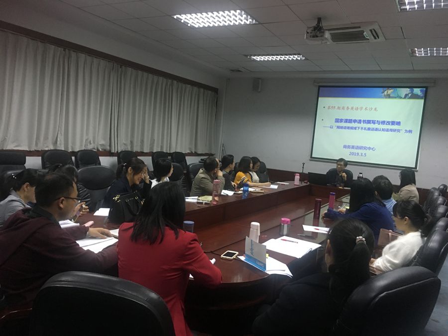 3月5日下午,suncitygroup太阳新城在第二行政楼308会议室举办第55期商务英语学术沙龙。本期沙龙由商务英语学科带头人曾利沙教授主持,主题为“国家课题申请书撰写与修改要略”。suncitygroup太阳新城袁鑫副院长、龙海英副院长和商务英语系全体教师出席了沙龙研讨。