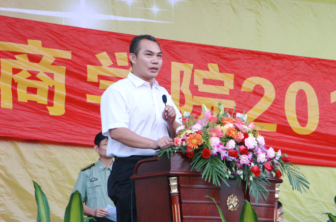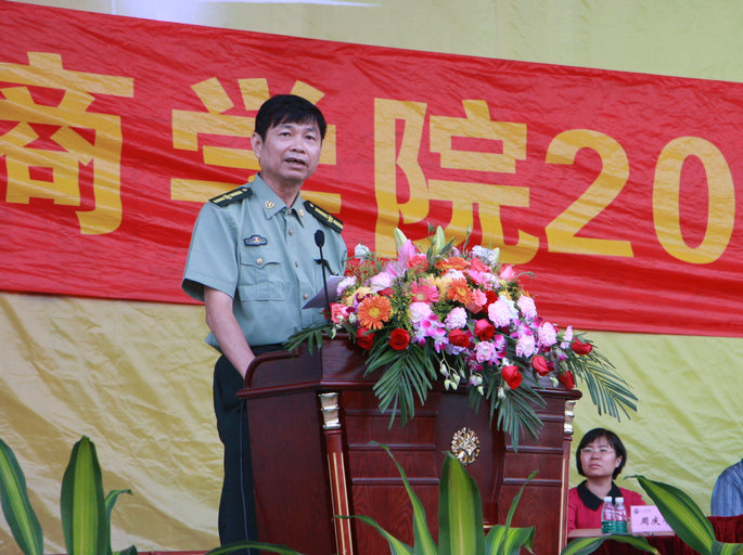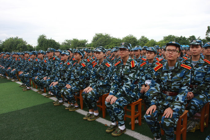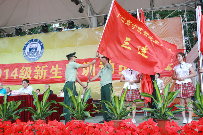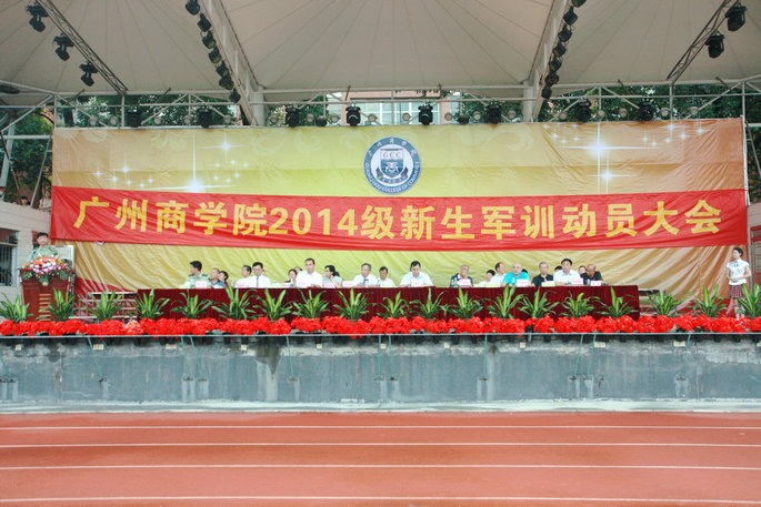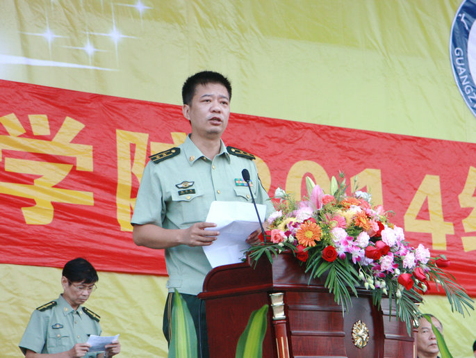党委书记谭马利宣布2014级新生军训团开训,标志着广州商学院2014级新生进入为期10天的军训生活。