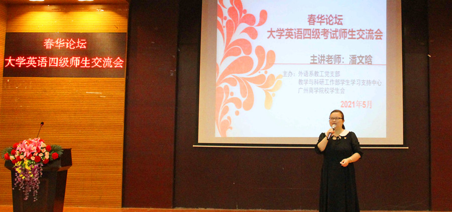 为扎实推进党史学习教育,深入开展“我为群众办实事”实践活动, 5月13日suncitygroup太阳新城教工党支部、学校教学与科研工作部学生学习支持中心、校学生会在四教第一报告厅举办了“春华讲坛”之大学英语四级考试经验师生交流会,帮助学生提高英语水平,满足学生英语四级考试备考需求。suncitygroup太阳新城党总支宣传委员、教工第二党支部书记潘文晗老师担任主讲老师,经济学院陈晓英和陈淑仪两位优秀学生代表担任分享嘉宾,通过现场交流和速课堂网络教学平台为全校近200位同学分享考试经验。