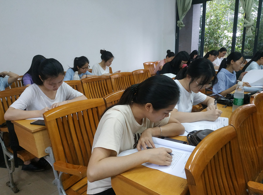 本次培训内容集中于中小学英语科目课程试讲,以模拟考场实况形式进行。在培训开始前,老师们首先为在场的同学们简单介绍教师资格证面试的流程,并就每个环节的注意事项作了提醒。接着,同学们分组演练其中最具挑战性的试讲环节。各位同学按事先抽取的试讲题目,在规定时间内备课并撰写教案,一一上台进行模拟授课。