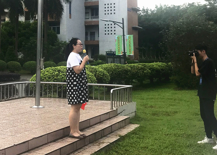 7点整,国旗护卫队着装整齐、步伐矫健,护卫着鲜艳的五星红旗入场。伴随着《义勇军进行曲》,国旗冉冉升起,全体师生庄严肃立,高唱国歌,向国旗行注目礼。五星红旗在空中飘扬,人群中响起熟悉的旋律,16级学生党员代表陈小婉,学生代表欧嘉洳等6名同学随着熟悉的旋律,从学生队列中缓缓走出,唱起了《我和我的祖国》。唱出了“我亲爱的祖国,我永远紧贴着你的心窝”温馨和深情,校园里响起了这一刻骨铭心的旋律,手中鲜艳的小红旗,随着旋律摆动着,映着葱郁的绿草,形成了一道亮丽的风景线。最后,黄玉亭发言:她强调升旗仪式是培养新时代爱国主义情怀的绝佳时机,希望新时代外院青年要热爱伟大祖国,在有限的大学时光勇于砥砺奋斗,练就过硬本领,担当时代责任。