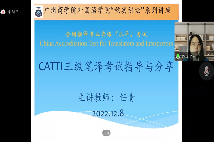 为进一步服务我校学子考级考证,开展“我为群众办实事”实践活动,我院教工第一党支部联合院学生会于12月8日下午,通过腾讯平台开展2022年“秋实讲坛”系列讲座之CATTI三级笔译分享交流会。本次交流会由我院商务英语系“双师双能型”教师任青和我院第一党支部组织委员、商务英语系专任教师张珊主讲,教工第一党支部书记何瑞玉、教工第一党支部宣传委员朱渺以及我院200多名学生积极参与到此次讲座中。