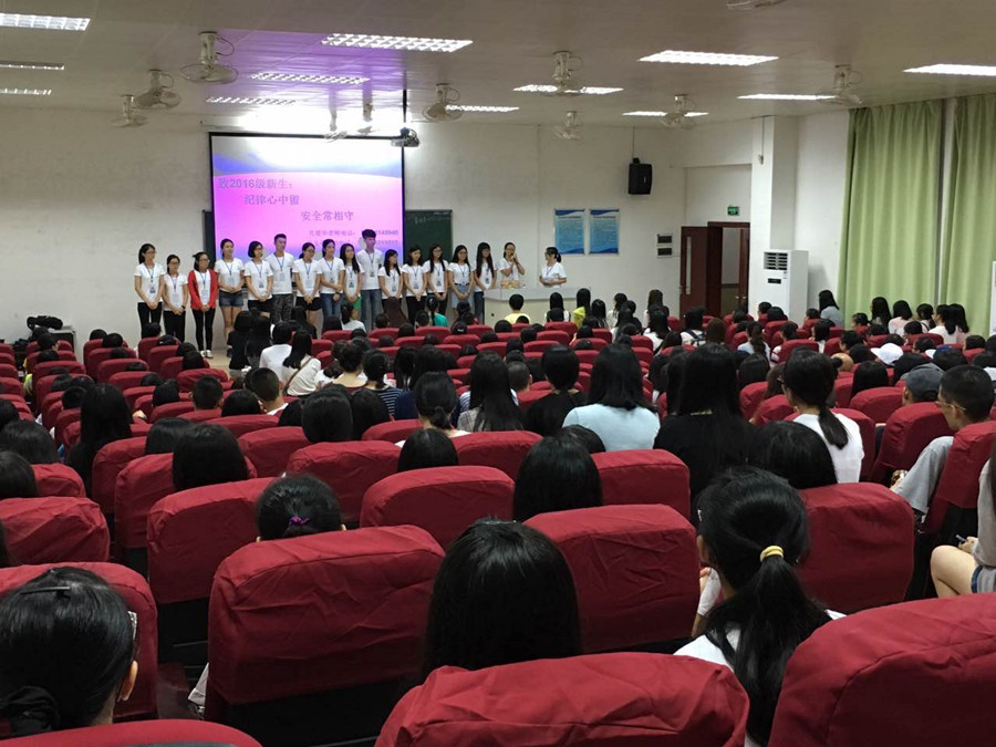 9月11日19:30,suncitygroup太阳新城于第一报告厅、第二报告厅顺利开展了以“纪律心中留 安全常相守”为主题的学籍与纪律管理新生教育讲座,suncitygroup太阳新城新生辅导员黄玉亭和孔建华、全体新生学长和七百多名新生一同参加了讲座,讲座由新生学长陈书娴和吴茂莹主讲。