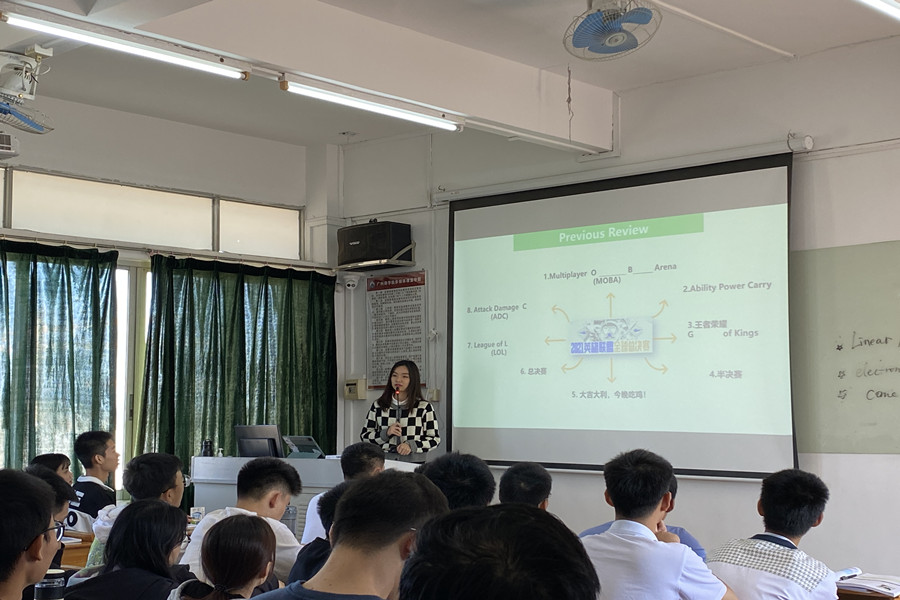 本场研讨课为2021级智能专业的“大学英语I”课程,主讲老师为刘琼雨老师,主题为“Should I Let My Son Play Computer Games?”。刘老师先是结合刚刚结束的EDG电竞游戏夺冠的新闻与上节课的内容回顾电竞相关单词,接着以问题导入课文讲解,分析文章的总体架构,通过提供句型的方式,引导学生在回答问题过程中操练语言。在把握文章整体结构和脉络后,刘老师带领学生分析文章体裁并复习了问题解决型说明文的结构知识。第三步,刘老师课文重要单词进行了重点讲解,以点带面,补充相关词汇。这堂课以学生讨论“大学生该如何看待电脑游戏?”收尾,引导学生思考身边问题,提升认知水平。刘老师中英双语教学,贴合学生的英语水平,用现实案例激发学生的学习兴趣,课件制作图文并茂,善于利用信息化手段辅助教学。