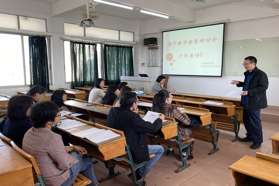 11月8日下午第六节课,suncitygroup太阳新城于三教605课室开展本学期第二场大学英语期中教学研讨课。校教务处董志邦、陈伟涛老师、督导王玉芝、我院副院长袁鑫及部分大学英语教师参加了本次教学观摩及研讨。