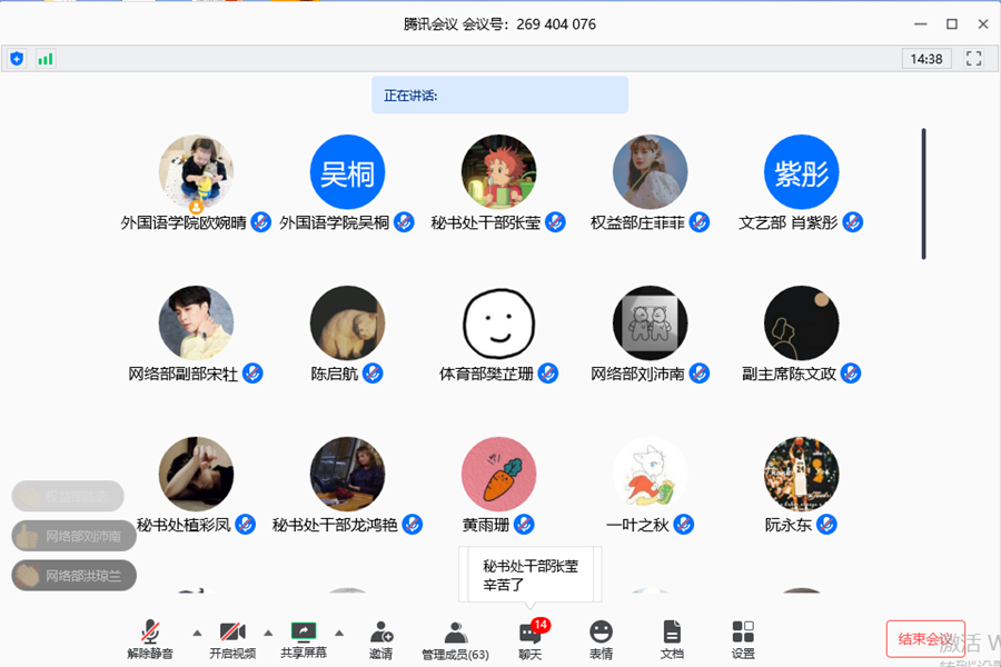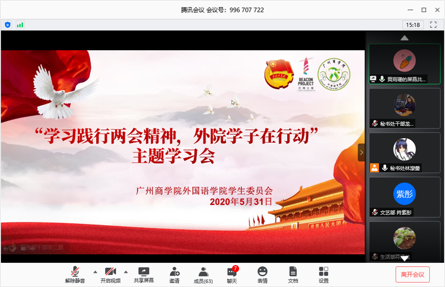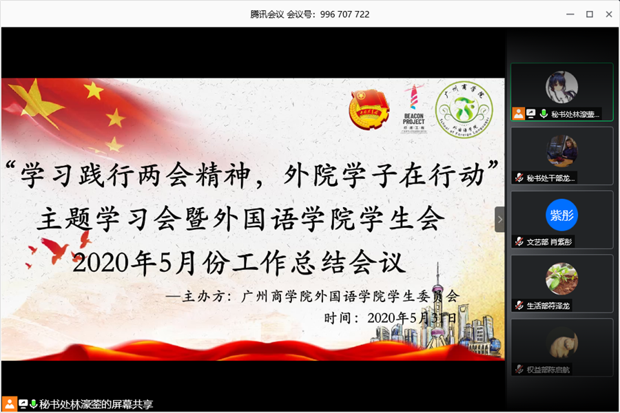 为深入学习宣传贯彻全国两会精神,引导我院学生干部深刻领会两会的核心要义,同时展现我院学生干部不忘初心做好本职工作的精神面貌,确保学生工作的有序开展,我院学生会于5月31日15:00在腾讯会议平台上举行以“学习践行两会精神,外院学子在行动”为主题的学习会暨5月工作总结会议,出席本次会议的有学院党总支书记徐超,学院学生会指导老师伍思颖以及学院学生会全体干部。