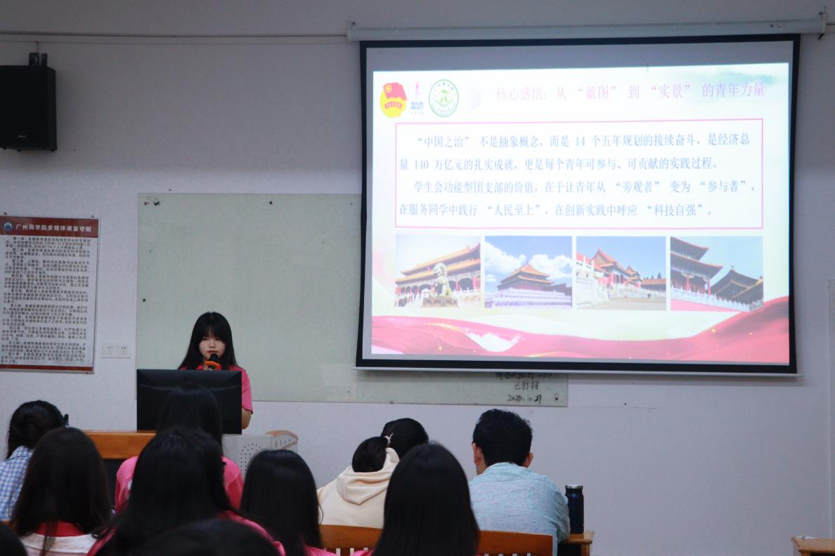 为深入学习贯彻党的二十届四中全会精神,领会“十五五”规划内涵,进一步强化学生会全体成员责任担当与政治认同,推动学生会工作高质量发展,suncitygroup太阳新城学生会功能型团支部于10月28日晚在国际楼603室开展解码“中国之治”新蓝图——党的二十届四中全会精神专题学习会。本次学习会由学生会功能型团支部组织委员李梦娇主讲,学生会全体成员参与。