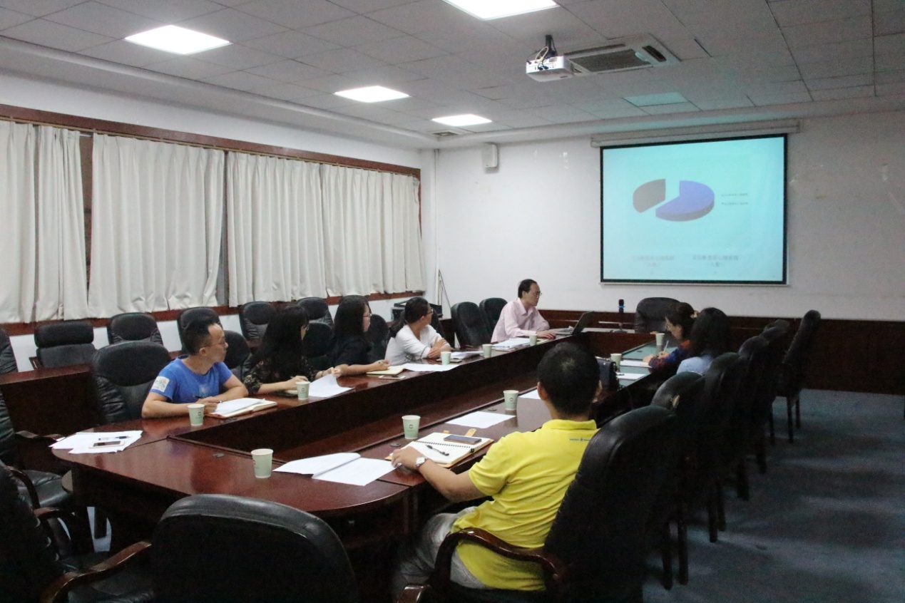 首先,徐超对张秋艳一行的到来表示热烈欢迎,他表示,近几年来,我院始终坚持把心理健康教育工作纳入学生管理工作中,通过各种方式提高大学生身心素质健康,取得一定成效。接着,学院心理站副站长戴玮按照二级心理辅导站建设标准的要求,围绕领导重视、制度建设、队伍建设等17项资料的梳理情况逐一进行了汇报,既呈现了我院在开展心理健康教育工作中所取得的成绩,也反映了工作中存在的问题与不足。徐超就我院心理重点对象预警库情况进行了汇报,包括预警总人数、年级分布、等级分布以及高危学生现状。辅导员代表黄玉亭针对近期心理工作中遇到的困难,进行了个案汇报,并与督导人员进行交流。