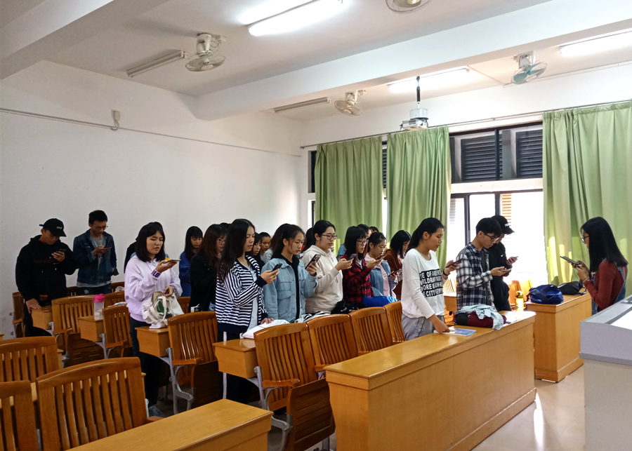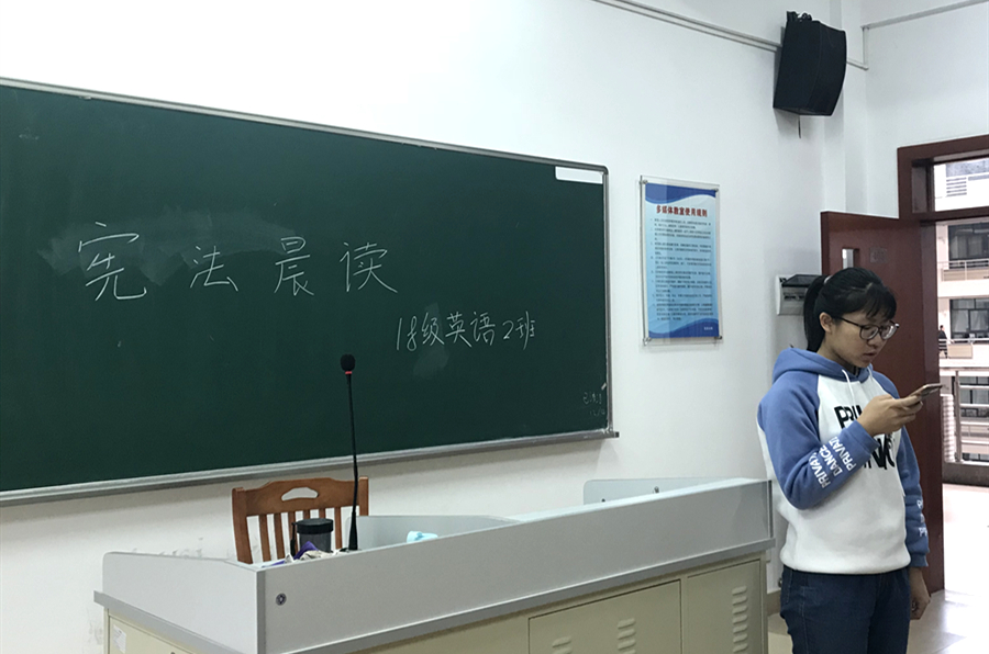 2018年12月4日是第五个国家宪法日,也是第一个“宪法宣传周”。主题是尊崇宪法、学习宪法、遵守宪法、维护宪法、运用宪法。为了积极响应教育部的号召,进一步增强学生法律意识,我院于当天早上7点半在多个课室同时举行宪法晨读活动。各班团支书选择宪法序言及正文中的部分章节、条款组织同学集体朗读。所有人精神饱满,情绪激昂,大声跟随诵读,用心体会宪法的庄严与神圣。