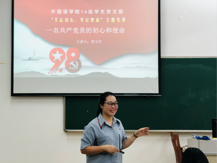 黄玉亭以“一名共产党员的初心和使命”为主题开讲。她从中国共产党梦想开始的一艘红船到创造了一个又一个奇迹的光辉历程深入诠释了我党坚定的“为中国人民谋幸福,为中华民族谋复兴”的初心。紧接着,黄玉亭从“启蒙初心、滋养初心和践行初心”三个层次讲述共产党人应有的初心与使命。其中,由“中国共产党为什么行?”这一问题引发全体党员的思考与热烈讨论。其次,通过全体朗读、党员代表带读、逐句讲解等方式对照学习了《中国共产党章程》的总纲、党员八项义务和八项权利。朗朗读书声,让党课的学习氛围更加积极热烈。最后,黄玉亭以重温入党誓词的方式讲解了入党誓词起源和重要意义,让全体成员从这份庄严的承诺中感悟信仰的神圣和伟大。