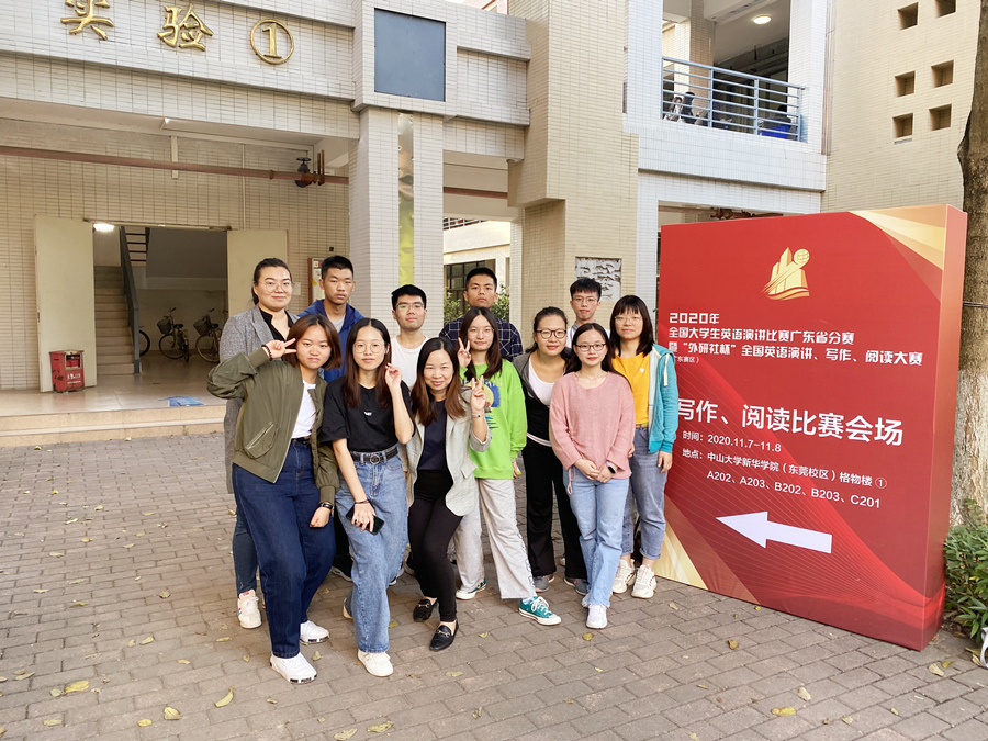 11月7日,2020年“外研社· 国才杯” 全国英语写作、阅读、演讲三大赛广东赛区复赛在中大新华学院东莞校区拉开帷幕。在领队和指导老师李卓华带领下,指导老师邵春发和陈慧以及我校的9名优秀学生选手一同前往参赛。