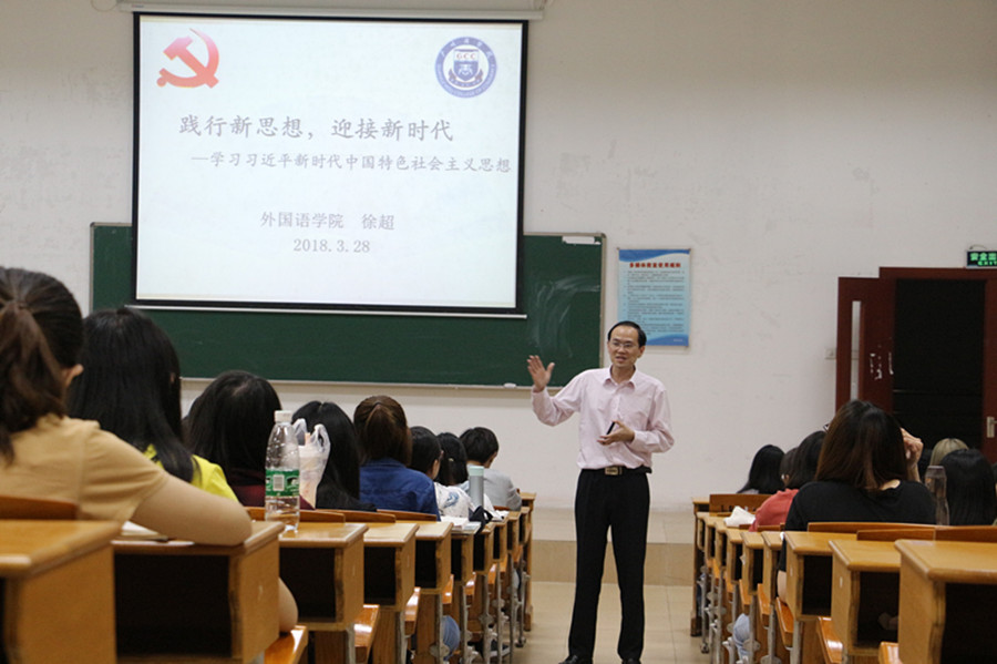 3月28日晚,suncitygroup太阳新城在第四教学楼310课室开展了主题为“践行新思想,迎接新时代”的新学期“思政第一课”。本次课程由suncitygroup太阳新城党总支书记徐超主讲。辅导员孔建华老师、16级德语、日语专业全体学生到场听课。