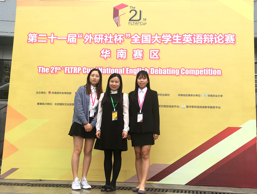 第二十一届“外研社杯”全国大学生英语辩论赛华南总决赛于3月23日至3月25日在华南农业大学落幕,来自广东、福建、湖北、湖南等98支辩论队伍参加比赛。通过校级选拔赛的层层筛选,由2015级商务英语专业何嘉慧、叶小莹同学组队代表我校参加比赛,并荣获三等奖。