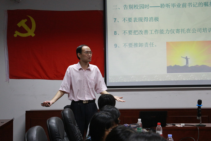 活动开班仪式,徐超发表了动员讲话,指出毕业生党员应结合“两学一做”学习教育认真学习,牢记党员责任、发挥模范作用,在社会的岗位上敬业奉献。紧接着,徐超以“让梦想在青春中起航”为毕业生党员开讲了一场专题讲座。在讲座中,他以“一起走过的日子、告别校园、祝你一路顺风”三首歌为主要思路,首先,他以国家、省市、学院和年级在2012-2016四年间的重要时刻,一同回顾了2016届毕业生一同度过的悠悠岁月;接着,他以“九个不要”的嘱托寄语毕业生在步入社会工作中要脚踏实地和锐意进取;最后,他以“共筑中国梦”愿景,鼓励毕业生党员要坚定理想信念,练就过硬本领、敢于创新创造、矢志艰苦奋斗和锤炼高尚品格。讲座过后,徐超带领全体毕业生党员重温入党誓词。