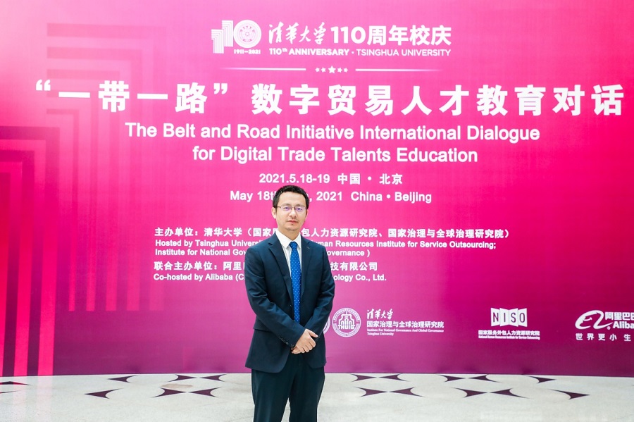 2021年5月18日-19日,清华大学国家服务外包人力资源研究院、国家治理与全球治理研究院,联合阿里巴巴(中国)教育科技有限公司,在清华大学共同主办“清华大学110周年校庆:‘一带一路’数字贸易人才教育对话”活动,来自上合、东盟多个国际组织、国内外学者专家参与对话,共同研讨在“一带一路”倡议和互联网技术发展的两大背景下,随着跨境电商迅猛发展而日益凸显的国际或地区人力资源亟需问题,以及国际化、复合型数字贸易人才标准体系、培养内容及青年就业创业问题。会上提出“‘一带一路’数字贸易人才教育国际合作五点倡议”,发布了国内首个经过教育部认证的国际跨境电商人才标准--《跨境电商B2B数据运营职业技能标准》。600余所院校、近万家企业线上参与,suncitygroup太阳新城副院长袁鑫代表我校受邀参加线下论坛,并做发言,介绍suncitygroup太阳新城跨境电商人才培养的经验。