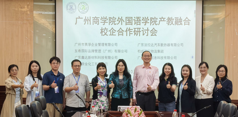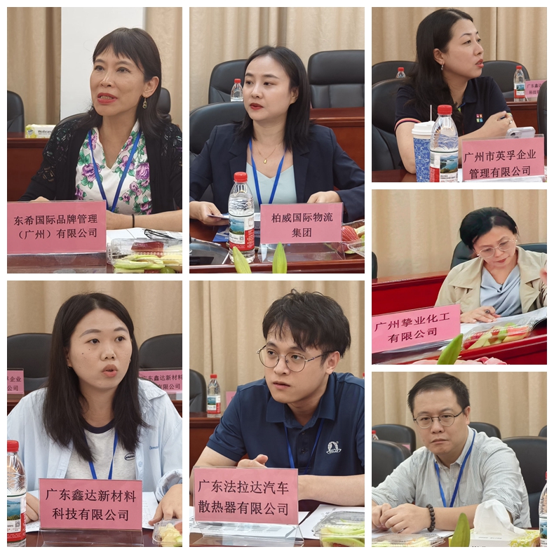 出席本次会议的企业有广州市英孚企业管理有限公司、东希国际品牌管理(广州)有限公司、广东法拉达汽车散热器有限公司、广东鑫达新材料科技有限公司、柏威国际物流集团、广州挚业化工有限公司、广州太信信息科技有限公司,涵盖了跨境电商、国际商务、语言服务、会展服务等领域。会上,郭遂红院长首先从学院概况、学生情况、生源质量、学生竞争力等方面展开了介绍,在随后的产教融合合作研讨环节,她进一步提出校企合作的具体方向,指出我院在构建“外语+商务”“外语+跨境电商”等复合型人才培养体系,可以从顶岗实习、推荐就业、双师培养、校企共同申报科研项目等方面进行深度合作,引发企业代表热烈讨论。双方围绕多元合作方式展开深入交流,针对企业提出的“人才供需错位”问题,探讨了“订单式培养”模式;此外,双方还就“行业导师进校园”“学生实习基地共建”“企业项目进校园”等合作形式进行了初步的探讨。