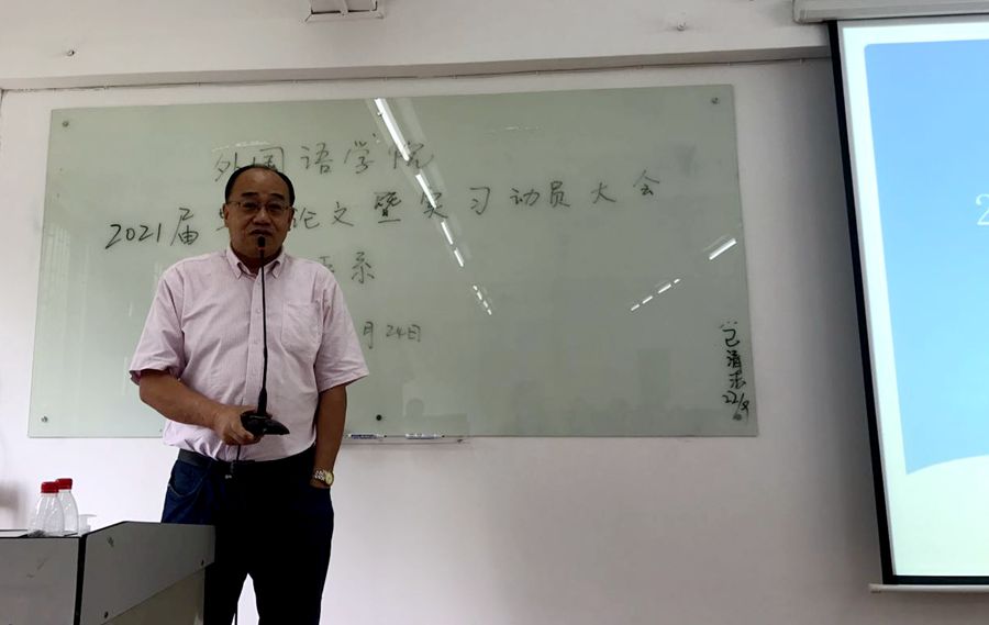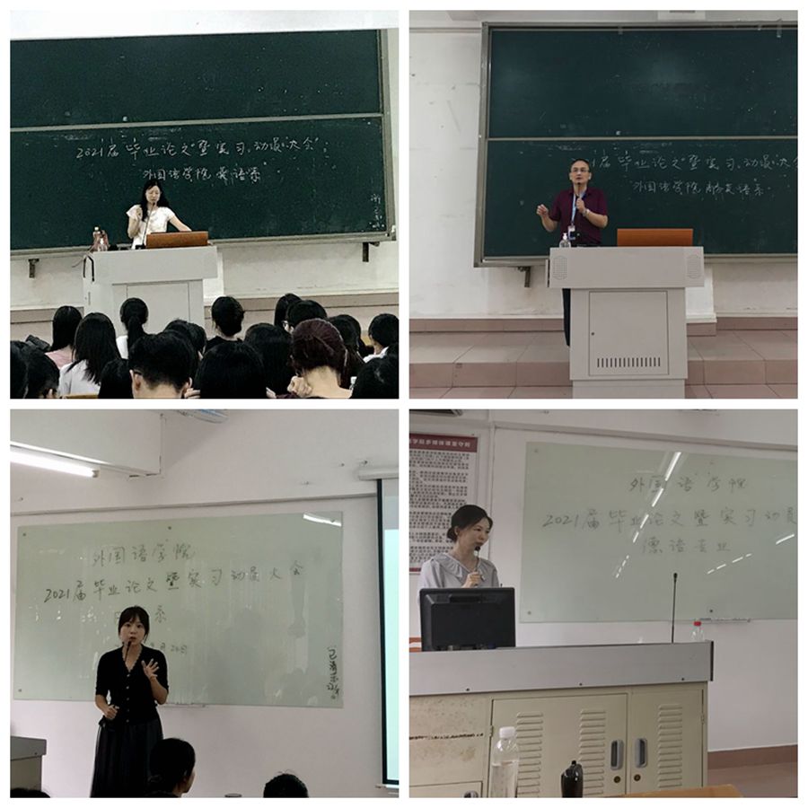 接下来,四位系主任首先分别有针对性对各个专业毕业论文写作做了专场讲座,向学生们指出毕业论文的重要性,并详细地解说了毕业论文选题范围、写作格式规范和注意事项,以及答辩注意事项等事宜。然后,各系主任就2021届实习工作安排及实习阶段主要任务和要求做了具体说明。