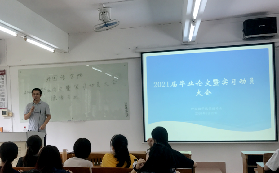 9月22日-9月24日,我院先后组织了德语、商务英语、日语、英语四个专业毕业生召开了四场“2021届毕业论文暨实习动员大会”,我院副院长袁鑫、德语专业系主任周昳旸、商务英语系主任李望华、日语专业系主任杨烨、专业带头人李晶教授、英语系主任程瑜瑜以及辅导员黄士库、刘丽参加会议。会议由各系主任主持。