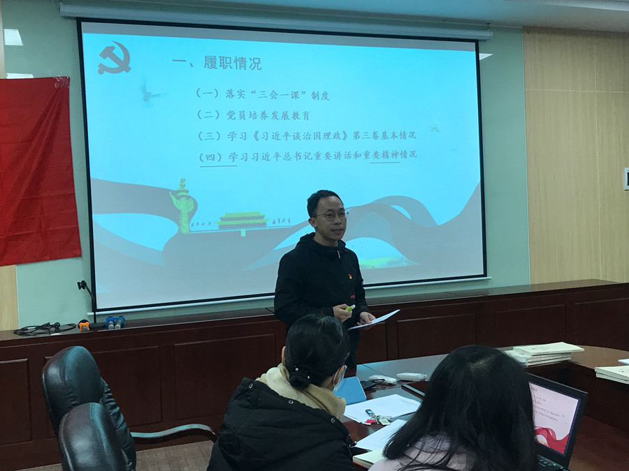 会上,各位党支部书记围绕日常党建工作开展情况,系统梳理汇报了各党支部学习《习近平谈治国理政》第三卷、党的十九届五中全会精神、习近平总书记出席深圳特区建立40周年庆祝大会上的讲话、重要指示精神、贯彻落实“不忘初心、牢记使命”主题教育、党支部在疫情防控中的战斗堡垒作用等内容,以PPT形式进行了总结、凝练和陈述,分析了各党支部在思想理论教育和学习、党建创新、活动形式等方面存在的问题与不足,明确了未来的努力方向和措施办法。其中,教工第二党支部书记潘文晗通过日常党建工作、党建活动推进情况、党员的自我提升、存在问题和改进措施四个方面作了2020年度党支部书记述职,汇报了教工第二党支部在组织志愿活动和党建品牌建设以及“三会一课”的落实情况,并从教学、科研、学科竞赛三个方面阐述了教工党员在学院发展,服务师生中发挥的先锋模范作用。17级学生党支部书记黄士库以“齐抓教育搞党建,共抗疫情保就业”为主题,从主题教育开展、党组织建设、党员思想引领三个方面汇报党支部年度工作情况、成效、不足之处和下一年度整改措施。20级学生党支部书记蔡文蝶以“建支部凝力量,建设活力党支部”为主题,通过凝练的数据将20级学生党支部自成立以来在新生中的宣传教育成果予以展示的述职方式获得了与会党员的高度肯定。