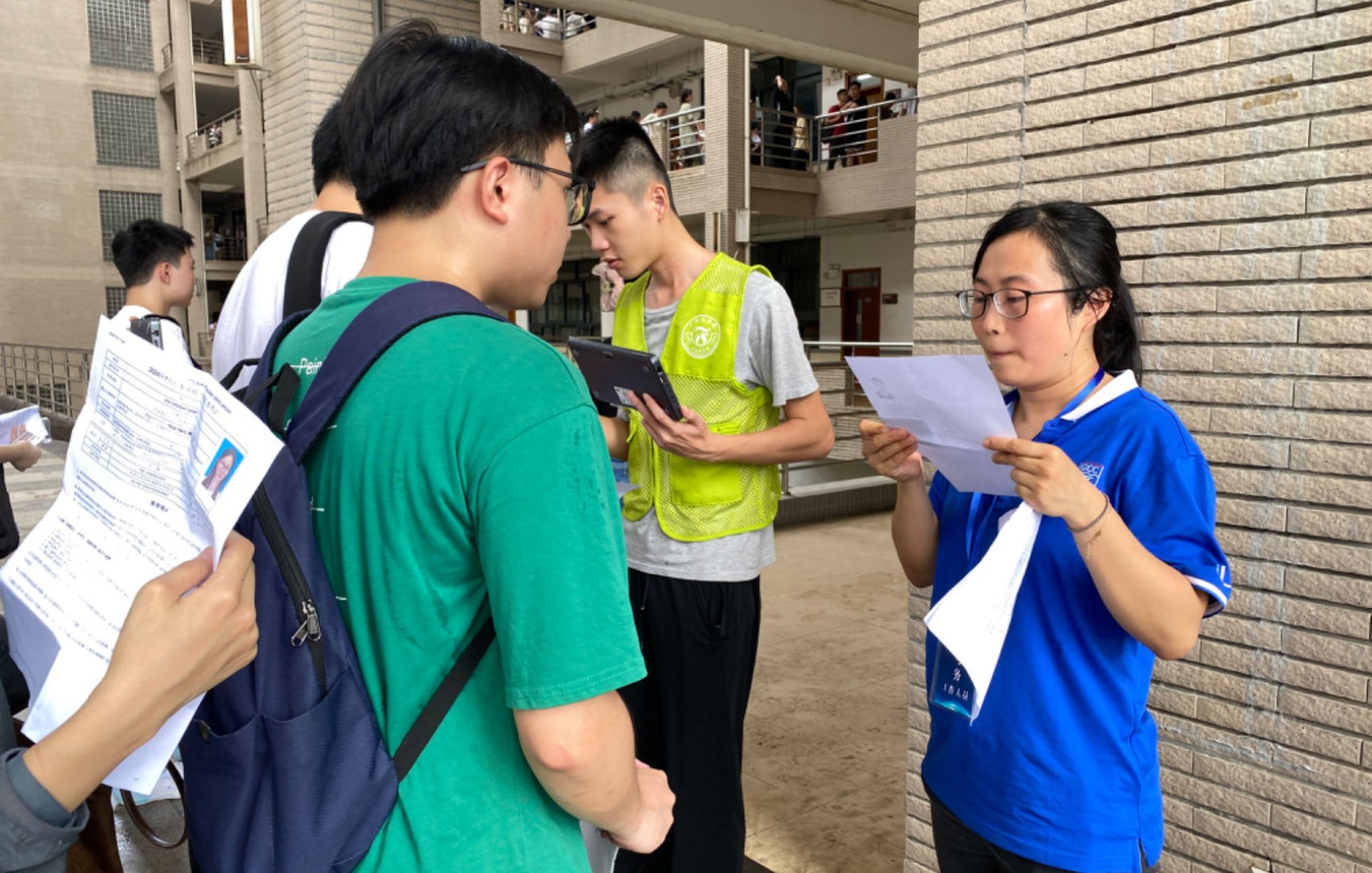 学生志愿者和考务人员严格进行考生人脸识别和信息核对