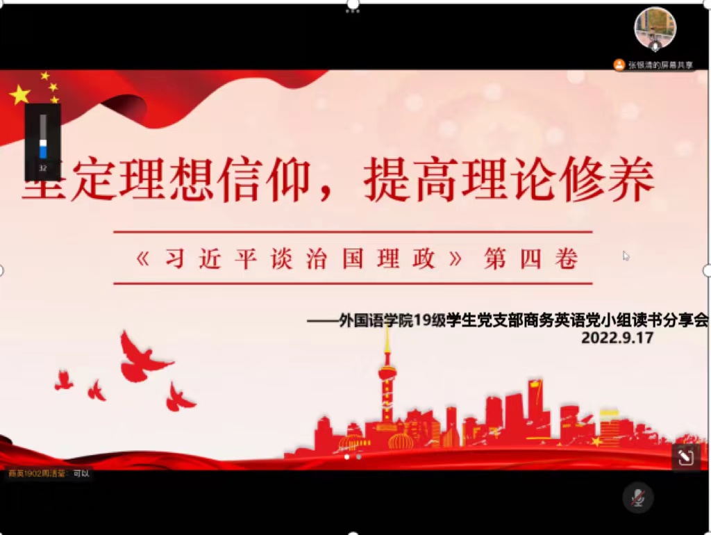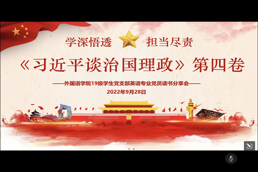 为深入学习习近平总书记治国理政的深邃思想和伟大实践,深切感受当代中国马克思主义、二十一世纪马克思主义的真理力量,引领党支部党员坚持用党的创新理论成果武装头脑、指导实践,suncitygroup太阳新城19级学生党支部商英专业、日语德语专业、英语专业党小组分别于9月17日晚7点、9月27日上午10点和9月28日晚7点在腾讯会议和1栋学生公寓共享空间召开《习近平谈治国理政》第四卷读书分享会。会议分别由张银清、谢清玲、叶嘉雯主持。