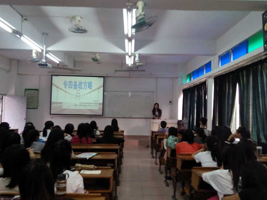 会议开始,黄玉亭分别从全国、独立学院及我院三个角度来分析了2012年英语专业四级考试情况,以此突出了专四备考的紧迫感和必要性。紧随着2011级学生代表通过精美的PPT,倾情相授,向同学们分享了自己备考时详细的计划和独特的技巧。卢穗娟跟大家分享了自己精密的备考计划和练习真题的技巧;刘洒玫认为听力模块需要不间断地练习,建议在错题集中战胜词汇与语法题,在总结重点句型、语法结构的基础上巩固写作模块;张鸿萧为大家推荐了听力练习软件并主张泛听变精听,在阅读备考中要注重扩大自己的单词量和阅读量;陈旭鹏分享了“在快乐中成功”的备考心态,鼓励大家树立积极的心态、享受备战收获的过程。最后,徐超发表了激情昂扬的动员讲话,并为大家介绍了专四成绩优秀的个人和集体享受“优先评优、优先发展入党”的奖励机制。