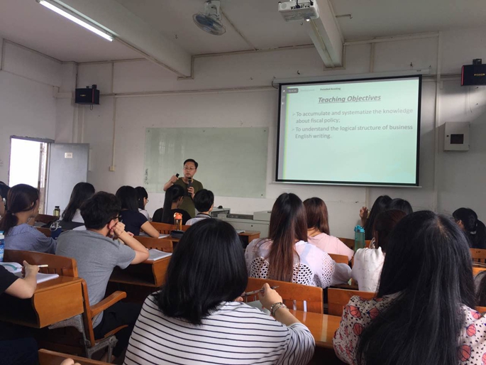 课堂上,吴峰松老师思路流畅,英语的语音语调标准,具有良好的英语教学基本功。他首先通过对商务英语词汇的分析、相关财政政策和货币政策的知识和术语引入,给学生在阅读时创造相应的语境线索,并将其系统化,建立财政政策和货币政策的图式,积极引导学生思考和表达。吴老师对课文进行深入的分析,把课文的要点组织成为条理清楚的结构图式,突出思辨能力培养,取得到了良好的课堂效果。