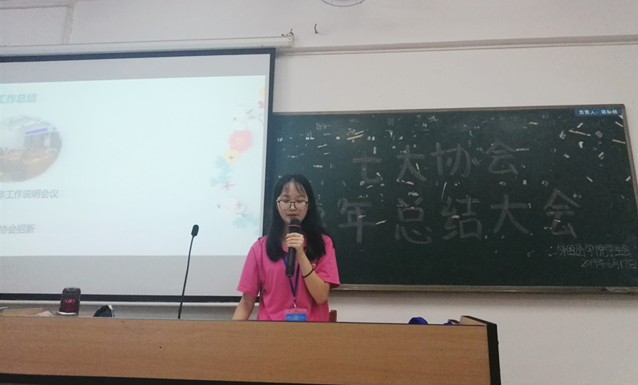 为了更好地总结回顾协会组织工作,营造鲜明的外院文化特色,我院学生会于6月17日晚上7点在五教205召开了七大外语协会2018-2019学年总结大会,出席本次会议的有学生会社团部部长王泽琳、副部长赖玉莹以及七大协会的代表们。