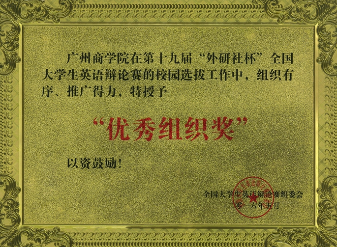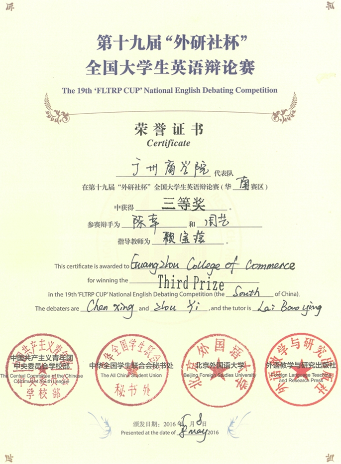 第十九届“外研社杯”全国英语辩论赛华南地区决赛于2016年5月6日至5月8日在广州南方医科大学落下帷幕,来自湖北、湖南、广东等130支辩论队伍参加比赛。我院通过选拔, 由2013级英语专业周艺、陈幸同学组队代表学院参加比赛,荣获三等奖 ,赖宝滢老师荣获优秀评委,广州商学院荣获“优秀组织奖” 。