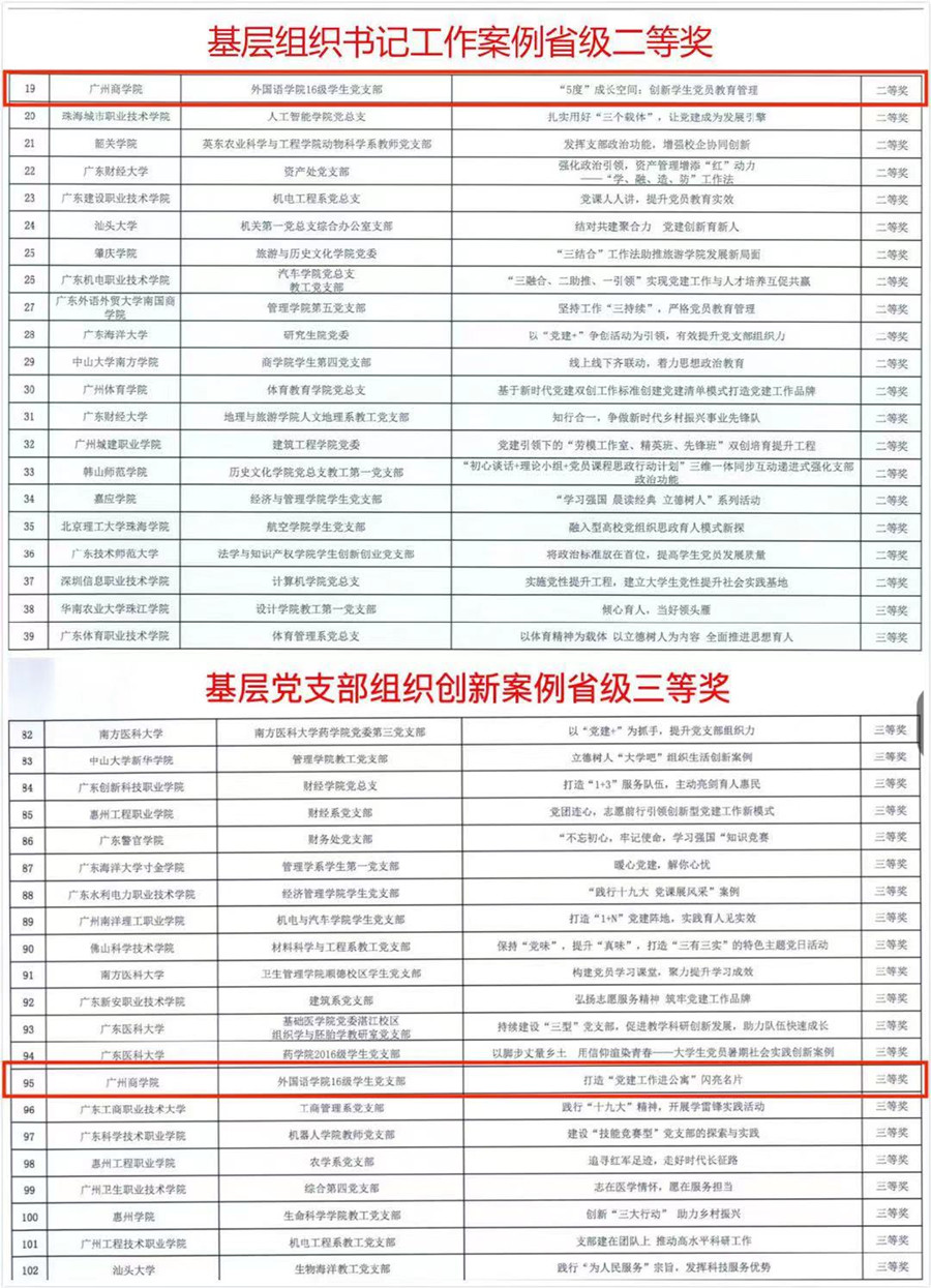 近日,中共广东省教育工作委员会下发《中共广东省委教育工委关于公布高校基层党建工作创新案例评选结果的通知》,我院16级学生党支部荣获两项省级大奖。其中,《“5度”成长空间,创新学生党员教育管理》案例荣获全省基层组织书记工作案例“二等奖”,《打造“党建工作进公寓”闪亮名片》案例荣获全省基层党支部组织生活创新案例“三等奖”。