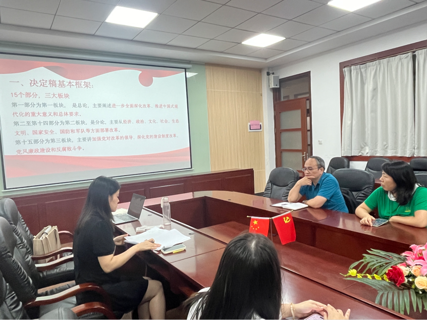 紧接着,朱渺详细介绍了党的二十届三中全会的基本情况以及会议通过的《中共中央关于进一步全面深化改革、推进中国式现代化的决定》的主要内容。朱渺从会议召开的背景意义、主要议程、核心成果三个方面进行了全面介绍,她指出,党的二十届三中全会是在我国迈上全面建设社会主义现代化国家新征程、向第二个百年奋斗目标进军的关键时刻召开的一次重要会议,为新时代新征程党和国家事业发展指明了方向。朱渺重点解读了会议提出的关于深化党和国家机构改革、加强党的全面领导、推进国家治理体系和治理能力现代化等方面的重大决策部署。她强调,这些决策部署是新时代坚持和发展中国特色社会主义的必然要求,是推进国家治理体系和治理能力现代化的重要举措。朱渺认为,作为高校党员教师,通过学习党的二十届三中全会精神,我们应充分认识到在新时代新征程中教育改革的重要性和紧迫性,激励我们更加坚定理想信念,将立德树人作为根本任务,不断学习新的教育理论,创新教学方法,以创新开放的态度对待教育工作,在实际工作中取得更多创新成果。