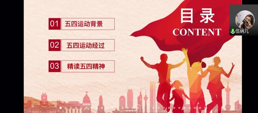 会议伊始,由伍思颖老师为团学干部讲授主题微团课,她通过结合五四运动的历史背景与经过,展示“爱国、进步、民主、科学”伟大五四精神;同时,伍思颖号召新时代的青年学生应该:一、为了民族的独立和解放,为了国家的繁荣和富强,前仆后继,英勇奋⽃,积极进取,勤奋⼯作;二、要努力学习科学⽂化知识,用科学的思想武器武装我们的头脑;三、勇于创新,为世界和平发展,⼈类社会的进步事业做贡献。