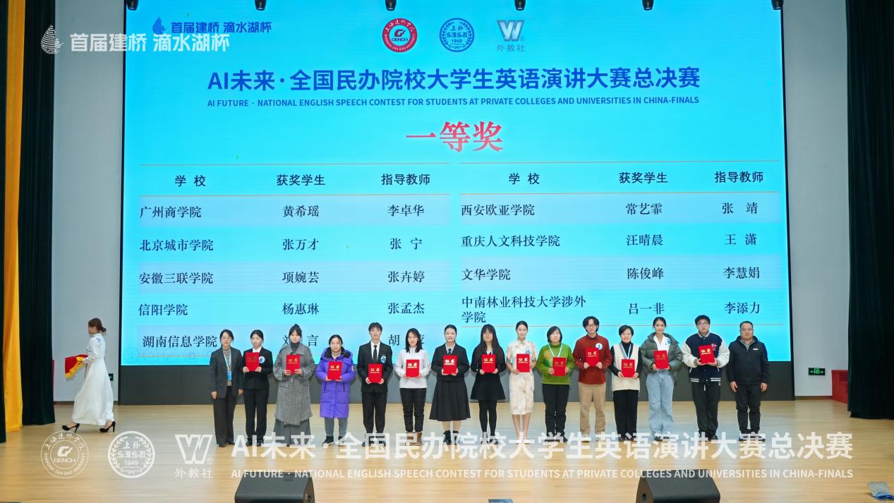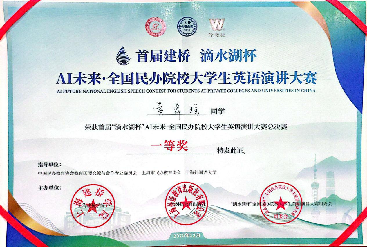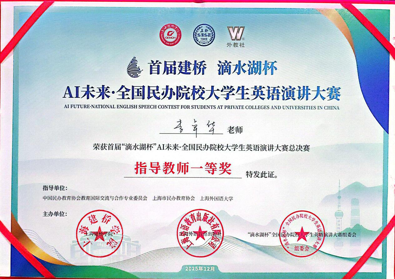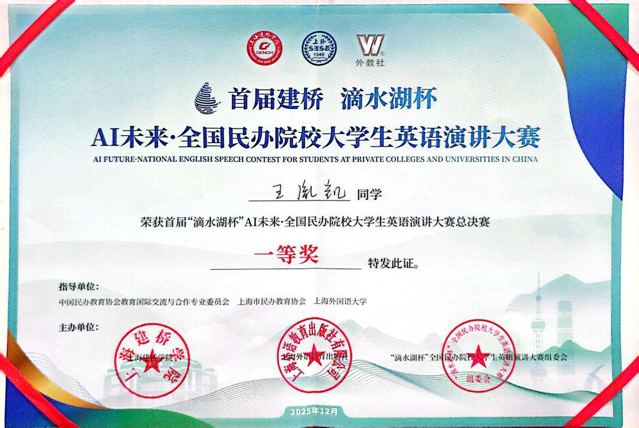 近日,“滴水湖杯”AI未来·全国民办院校大学生英语演讲总决赛在上海建桥学院圆满结束。suncitygroup太阳新城王胤凯同学、经济学院黄希瑶同学凭借出色表现双双斩获全国一等奖,suncitygroup太阳新城李卓华老师荣获“指导教师一等奖“称号。