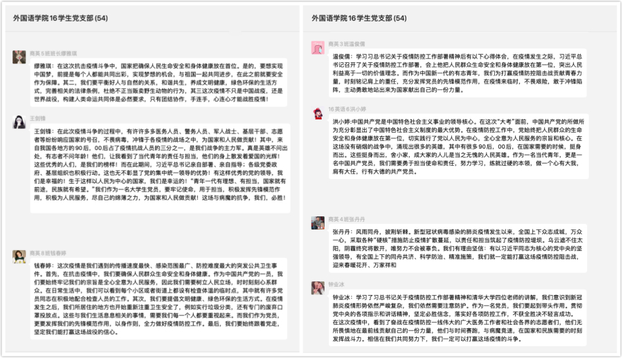会议开始,全体党员以学习习近平总书记关于疫情防控工作的重要讲话和指示批示精神等有关内容落实“第一议题”制度,从三个“最”、一个显著优势、七点要求、四颗心、一个警惕等一组数字学习了习近平对疫情防控的最新部署。各党员通过微信群依次分享和交流近期学习的心得体会。黄玉亭从落实“三会一课”制度、发展教育党员、组织党日活动、毕业生党员教育工作等方面详细部署了新学期党支部工作。还特别强调了疫情期间,全体党员主动作为,积极发挥先锋模范作用,争取做到“四带头”:做好防护要带头、严格服从要带头、学习就业要带头、关心群众要带头。此外,党员还针对疫情之下毕业生的学习就业心理动态现状、影响因素和引导方向进行了积极地讨论,为各位党员深入了解关心群众,传递积极正能量提供了实在的建议。
