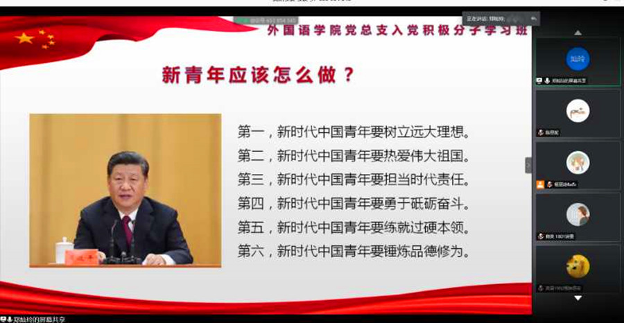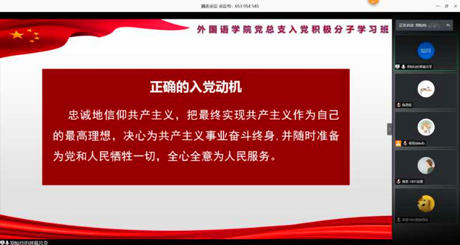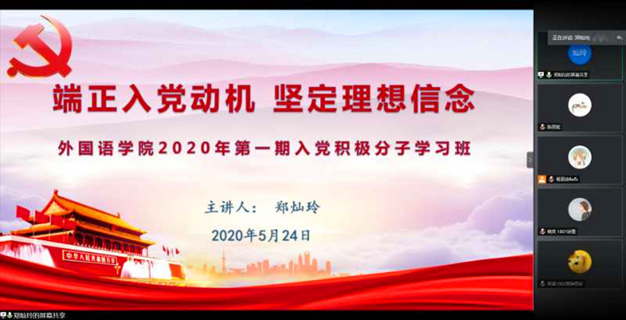 为进一步深入落实“端正入党动机,坚定理想信念”主题教育工作,扎实推进入党积极分子的学习教育工作,5月24日晚19:00,suncitygroup太阳新城分党校2020年第一期入党积极分子第三次党课培训于线上顺利开展。此次党课由广州商学院校团委副书记郑灿玲主讲,分党校助理教员李若薇同学主持,全体学员参加学习。