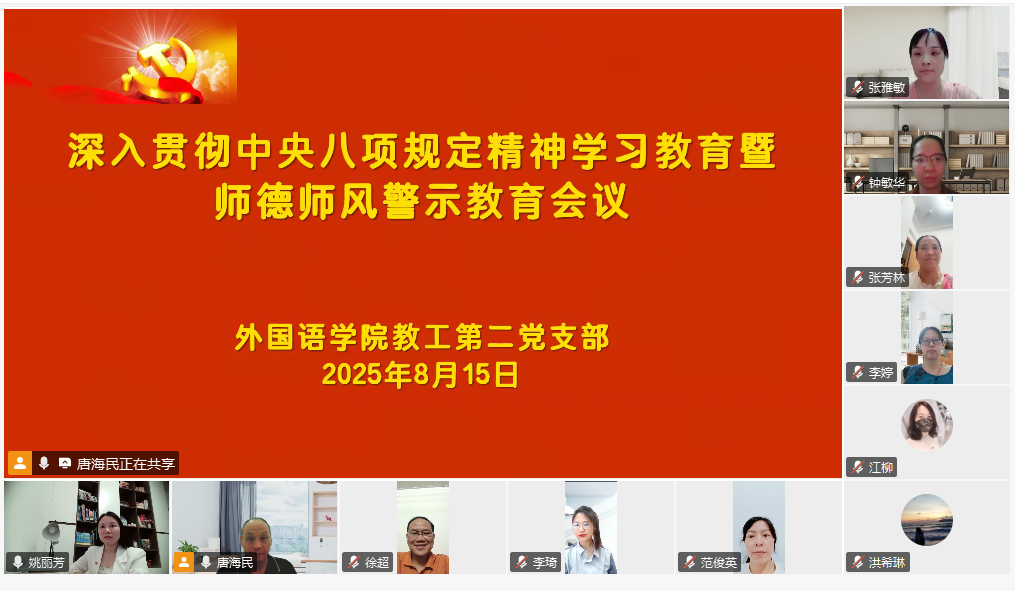 为持续开展深入贯彻中央八项规定精神学习教育,进一步强化师德师风建设,suncitygroup太阳新城教工第二党支部于8月15日通过腾讯会议平台召开师德师风警示教育会议。会议由党支部书记唐海民主持,支部全体党员参加。
