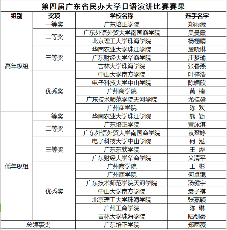 经过四个小时的激烈争夺,来自华南农业大学珠江学院的熊颖获得低年级组一等奖,来自广东培正学院的郑雨薇获得高年级组一等奖,同时郑雨薇还获得“总领事奖”的荣誉称号。