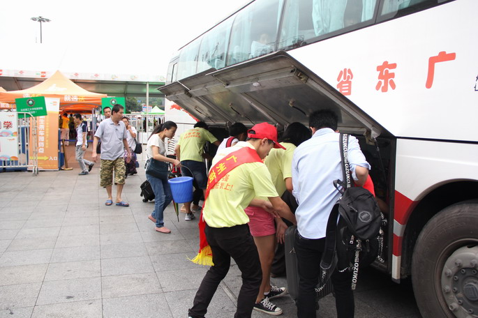 迎新期间天气晴雨不定,上午还艳阳高照,下午就下起了雷阵雨,这给迎新接待工作增加了不少压力。但校外接站的全体师生无畏风雨,坚守岗位,务求准确指引每一位前往我院报到的新生和家长,热情搬运行李上车。校外接待4个迎新站点,接送大巴坐满即走,等候时间不超过30分钟,直达报到大本营,安全便捷。