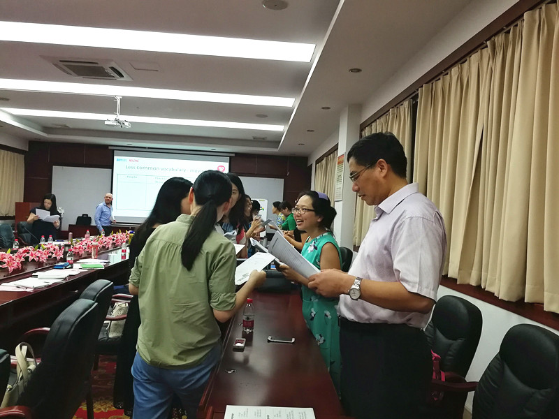 授牌仪式结束之后,雅思教师培训正式开始。英国培训专家Mark O’Sullivan首先简单介绍了雅思考试和中国学生在雅思考试中的短板,然后对与会英语教师进行了有针对性的雅思教学培训。整个培训内容充实,培训专家授课风格幽默。经过一天的培训,教师们对雅思考试和评分标准有了进一步了解,在有效组织课堂活动方面提高了业务水平。经过强化训练,每位教师均获得雅思培训教师的资格证书。期间,校长助理张忠福现场察看了教师们的学习培训情况,并参与到分组教学活动中去。马蔚兰院长也与该协会负责人进行了教学改革理念的沟通。