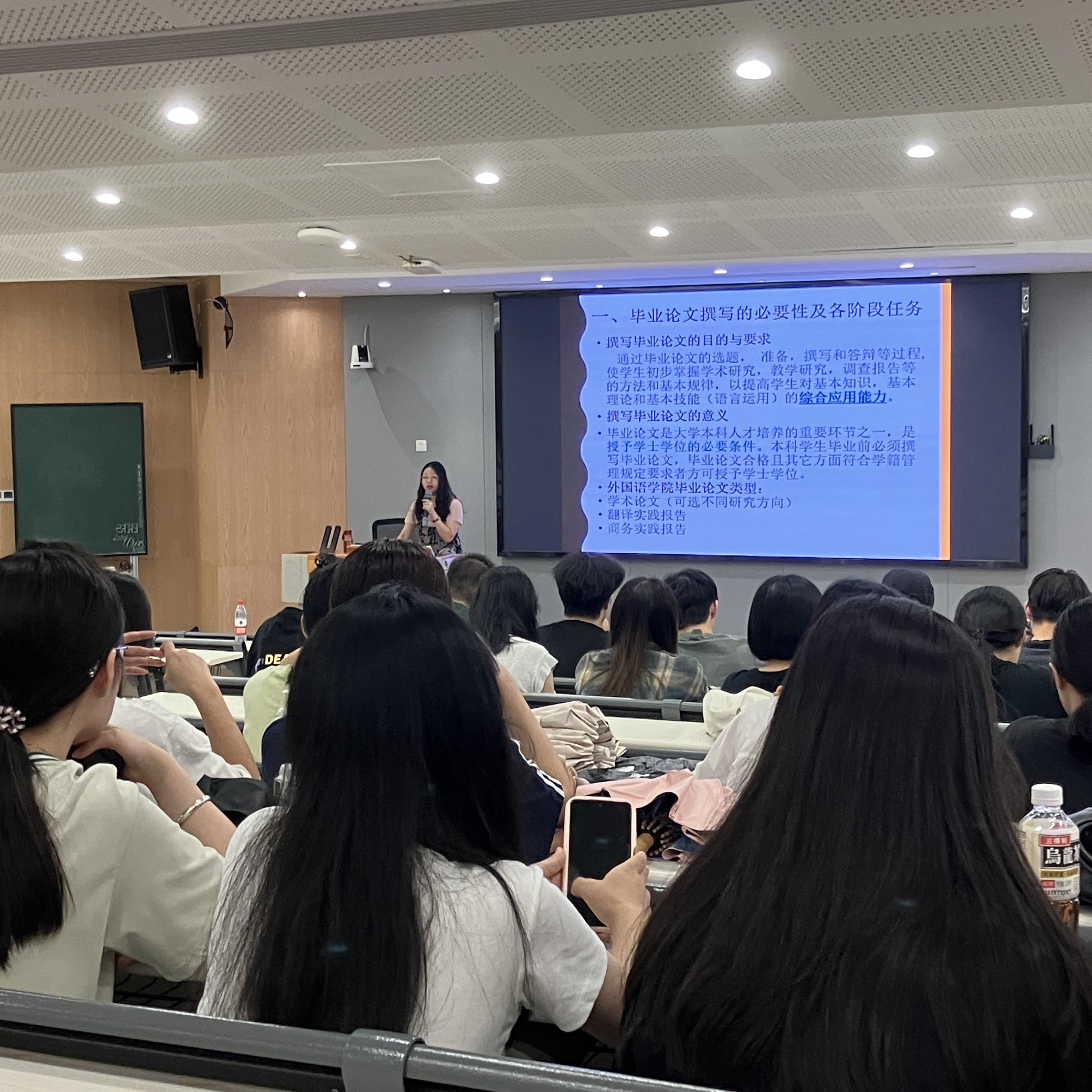 随后,大会进入各专业专场。由各专业系主任针对各自专业的特点,为同学们详细讲解了毕业论文和毕业实习的流程及注意事项。接下来,各系主任首先分别有针对性对各个专业本科毕业论文写作做了专场讲座,各系主任在动员大会上阐述了毕业论文的选题、写作、答辩等各环节的要求,从论文研究方向、论文选题、开题报告的撰写、论文框架的规划、摘要关键词以及参考文献、论文正文表达技巧、论文格式规范和注意事项等方面对毕业论文的写作进行了详细介绍和指导。各系主任并对2025届实习工作安排及实习阶段主要任务和要求做了具体说明,强调了同学们要合理规划时间,注意实习安全等问题以及平衡好毕业论文与实习之间、实习与就业之间的关系,并强调了实习对于提升专业技能、增强职业素养的重要性,鼓励同学们珍惜实习机会,积极投入实习工作。因工作不能参加现场会议的同学也观看了在线直播。通过高清直播画面和流畅的音频传输,校外实习的学生们仿佛置身于现场,能够清晰地看到PPT展示,听到系主任们的讲解。他们纷纷在直播间参与互动,表达自己对毕业论文和毕业实习的期待与困惑。线上平台的实时性、便捷性得到了充分体现,真正实现了“云端相聚,共谋未来”。