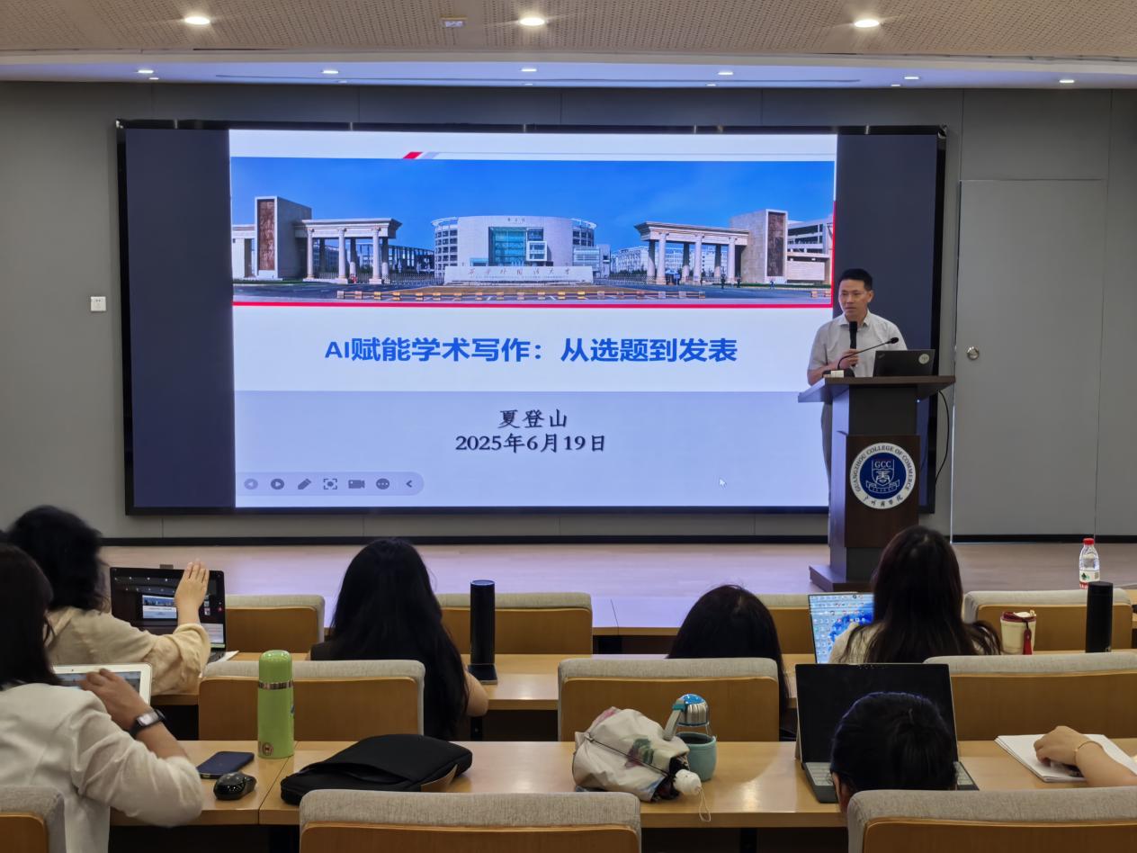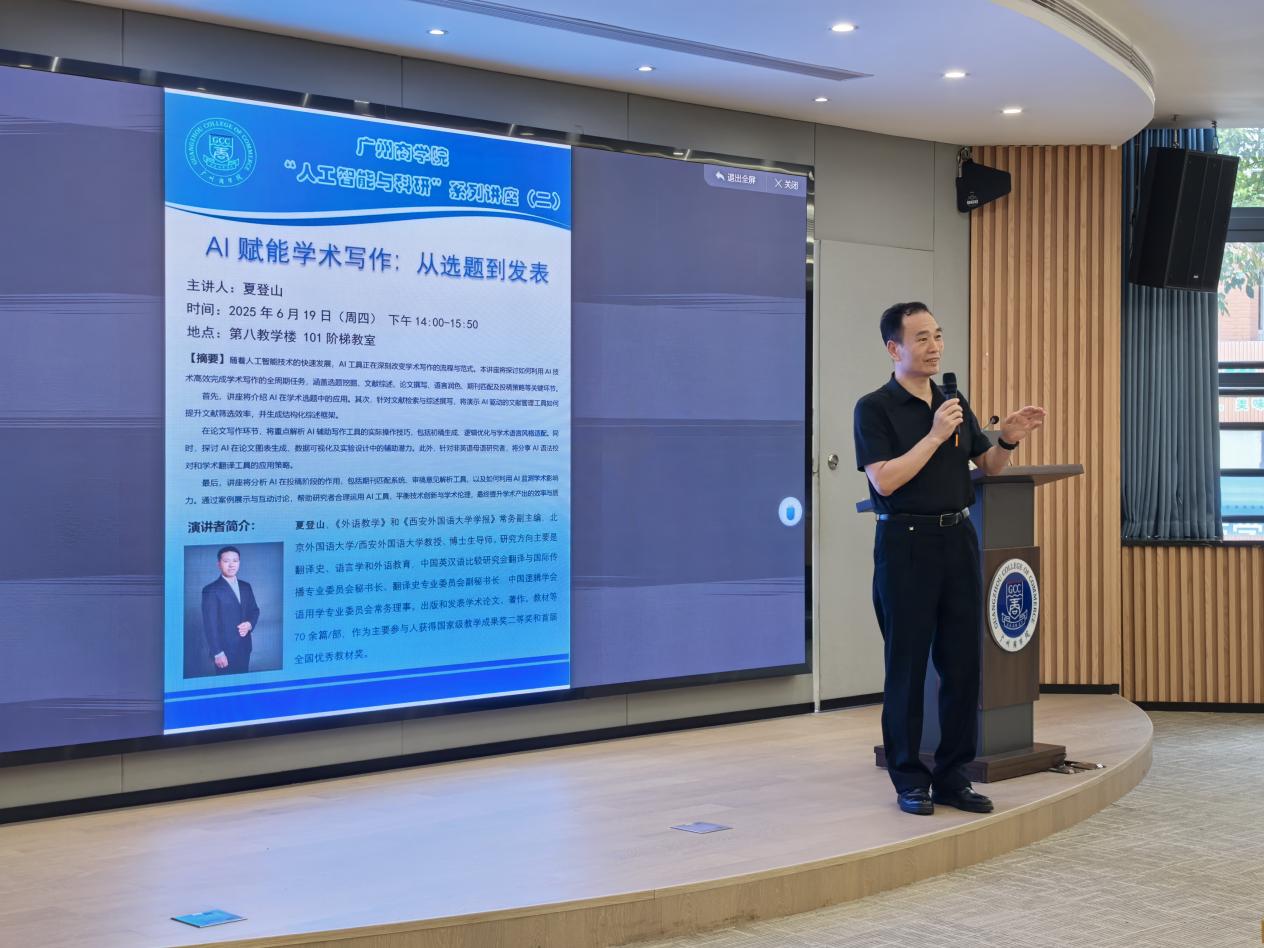 6月19日,广州商学院suncitygroup太阳新城在第八教学楼101报告厅成功举办“AI 赋能学术写作:从选题到发表”主题讲座。本次讲座由外语学科带头人莫爱屏教授主持,北京外国语大学、西安外国语大学教授、博士生导师夏登山教授主讲,suncitygroup太阳新城和国际学院全体教师齐聚一堂,共同探索人工智能技术如何深度革新学术写作全流程。