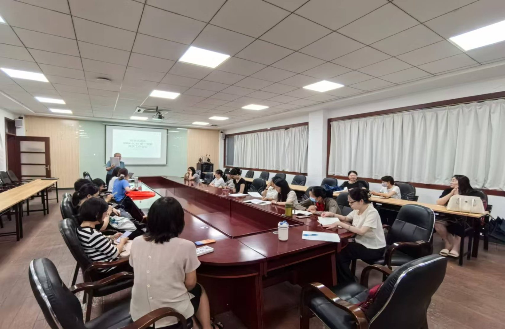 8月29日下午,商务英语系在第二行政楼108会议室召开新学期开学工作会议,会议由系主任李望华老师主持,商务英语系全体教师参加。会议围绕上学期教学反馈与总结、新学期上课准备、实习指导、论文指导、学科竞赛规划和编撰教学获奖成果手册的工作布署等方面展开。