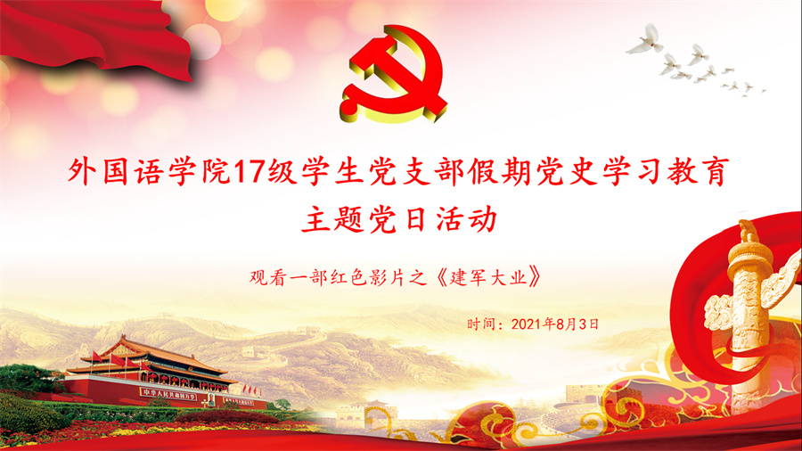 在“八一”建军节来临之际,为了更好地继承和发扬革命优良传统,延续新中国成立100周年的红色氛围,激发我院学生党员坚持理论和实际结合,历史和当下贯通,不断从党史中汲取前进的智慧和力量,8月3日晚上21:00,我院17级学生党支部通过线上腾讯会议开展了“观看红色电影”之细品《建军大业》主题分享会。共有30名党员同志出席了本次会议,会议由支部党员徐旭雯主持。